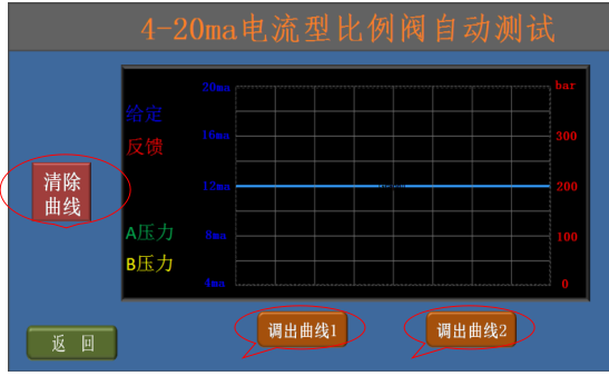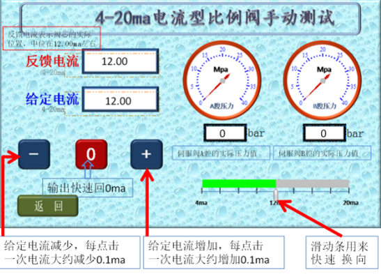 6、比例閥正常時的表現為:a、給定電流12.00ma時,反饋電流在12.00ma,比例閥輸出的A、B腔壓力相同;b、用滑動條可迅速換向,反饋電流改變且A、B腔壓力差較大;c、點擊增加按鈕,反饋電流逐漸增加且A、B腔壓力差逐漸增大;d、點擊減少按鈕,反饋電流逐漸減少且A、B腔壓力差逐漸減少,過12.00ma后比例閥會換向;